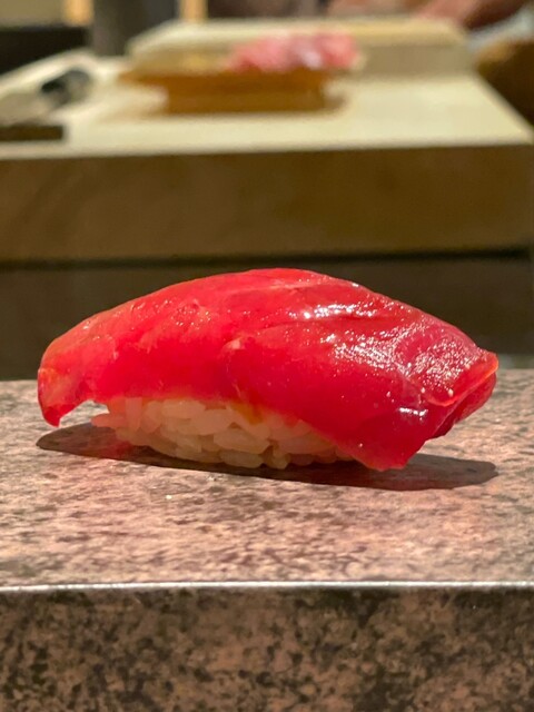 とろける脂と酸の効いたシャリが一体となる瞬間、鮨の完成形を感じる。赤酢が中トロの濃厚さを引き締めてくれる。