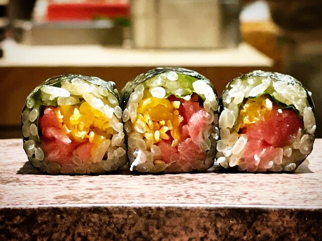 しっとりとした食感の奥に野性味ある旨味。脂は上品にまとまり、ほのかな温度が体温と同化していくよう。海の恵みと大地の恵みが交差するような、深みある一貫。