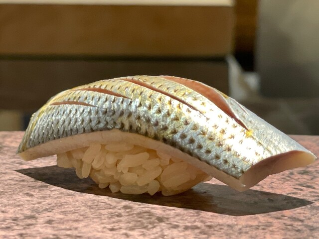 江戸前の技が詰まった一貫。酸味と旨味のバランスが素晴らしく、香りの余韻も長い。