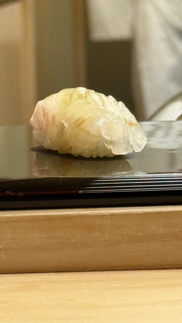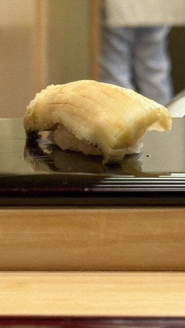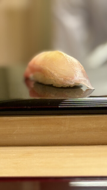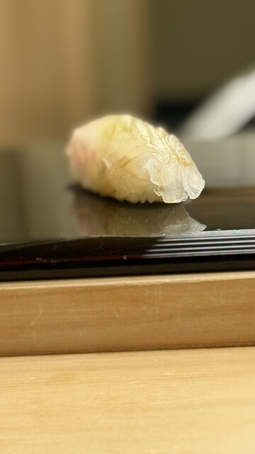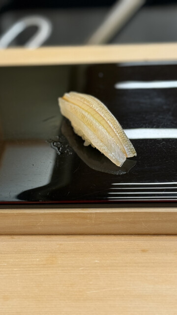 塩の当て方が均一で、身に締まりがありながらも柔らかい。旨みが凝縮され、口に入れるとほのかな甘みが広がる。舌触りはきめ細かく、余分な水分がない。シャリの酸味が全体をまとめ、味の軸がぶれない。塩の主張は抑えめで、素材の甘みを支える。握りとしての完成度が高く、白身の頂点を感じる一貫。