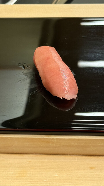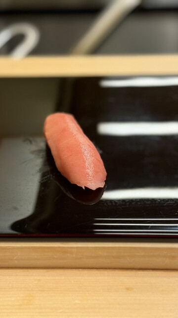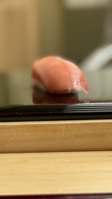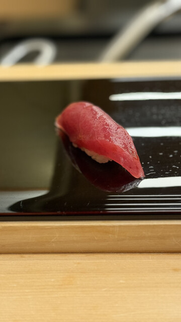 切りつけの厚みが均一で、筋目に対して完璧な角度で包丁が入る。舌の上でなめらかにほどけ、香りが澄んでいる。酸味と鉄分の香りがバランス良く、雑味がまったくない。シャリの塩味と酸が鮪の輪郭をはっきりさせ、余韻は静かに消える。温度管理が理想的で、香りの立ち上がりが自然。口に含んだときの温度、溶け方、後味のすべてが計算されている。
