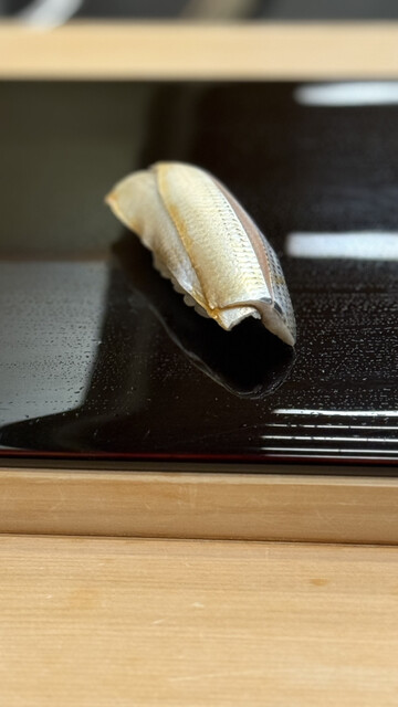 皮目の艶が見事で、締めの加減が極めて繊細。塩と酢のバランスが完璧で、酸が角立たず、皮の香りがすっと立ち上がる。二枚を重ねる技術も緻密で、口の中で層がほどけながら旨みが重なる。水分の抜け具合が理想的で、歯を入れた瞬間の張りとしなやかさが両立。後味が非常にきれいで、光り物の理想形と言える。