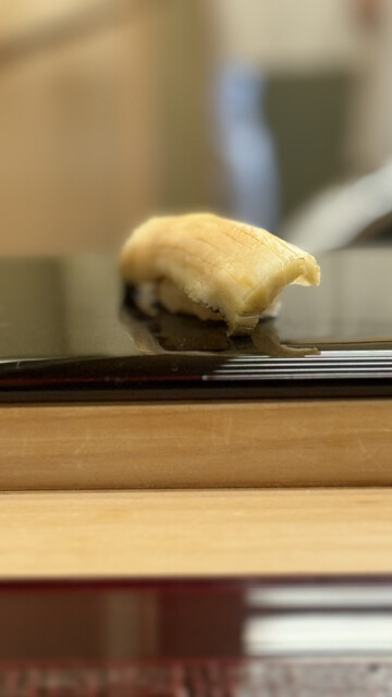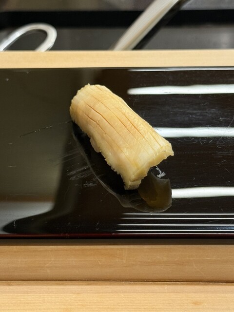 火入れは均一で、身の中まで出汁の旨みが行き渡っている。煮詰めの甘みは控えめで、塩味が骨格を作る。噛むと蛤の香りがふわりと立ち、余韻が長く続く。シャリとの一体感が素晴らしく、温度も完璧に合っている。伝統の江戸前仕事を今の時代にそのまま体現している。静かに完璧という言葉が浮かぶ。