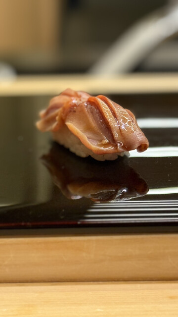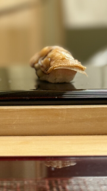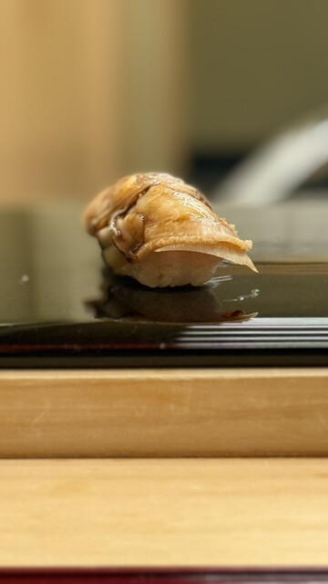 包丁が完璧に入り、筋が一切残らない。歯を入れると軽く抵抗し、その後に柔らかく解ける。香りに深みがあり、磯の香りが穏やかに残る。シャリの酸が鮑の旨みを押し広げ、噛み進めるごとに立体的な味わいになる。加熱や香味の足しは最小限。素材の力と技の精密さが一つにまとまった印象を残す。