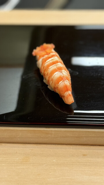 供された瞬間の香りが鮮明。まだわずかに温かく、噛むと弾力がありながらも柔らかい。甘みの広がりがはっきりしていて、余韻が長い。背の処理が丁寧で、えぐみが一切ない。シャリは少し温度を下げてあり、海老の温かさと一体化するように設計されている。火入れと塩の加減、提供のタイミングの精度が非常に高く、技の冴えを感じる一貫。