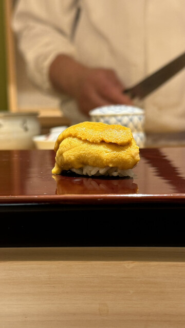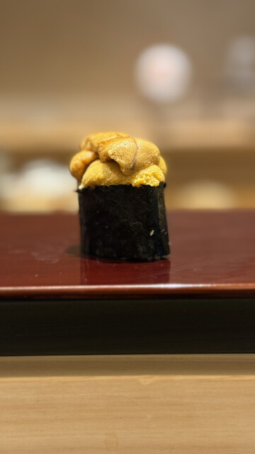 口に含むと、ねっとりとした甘みが広がり、シャリが瞬時にほどける。海水香と米酢の酸が織り交ざり、余韻に海の透明感を残す。ウニそのものの質が高く、苦みが一切ない。