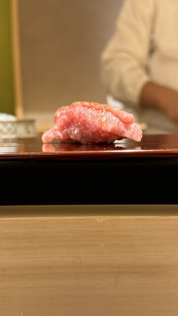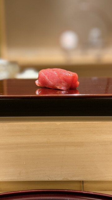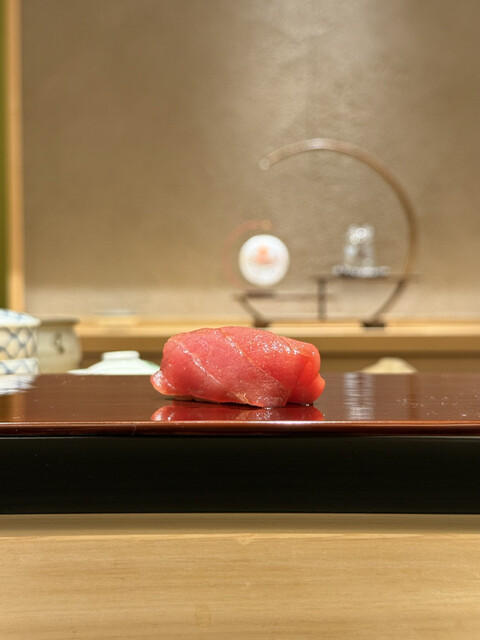 赤酢の酸がきりっと立ち、香りと旨みの輪郭をくっきり描き出す。握りの圧が均一で、米の粒立ちがそのまま舌の上でほどける。漬けダレの塩味が控えめで、鮪そのものの鉄分と香りが活きている。噛み終えたあとも酸味が口中を締め、余韻に芯がある。