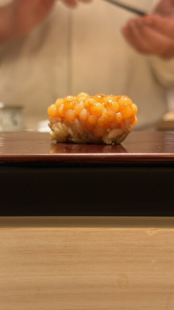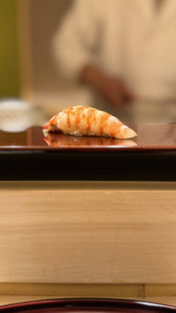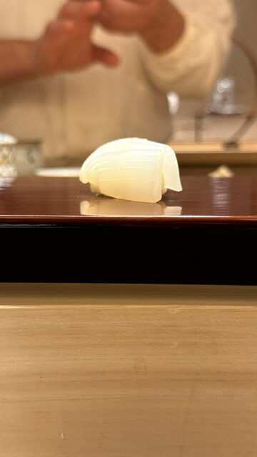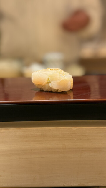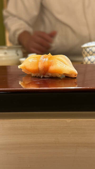 塩の加減が驚くほど繊細で、シャリの酸味と重ならず、イカ本来の甘さをきれいに引き出している。柑橘は酢橘を極薄に振りかける程度で、後味に清涼感を残す。派手さはないが、職人の包丁技術と塩の使い方が際立つ一貫。