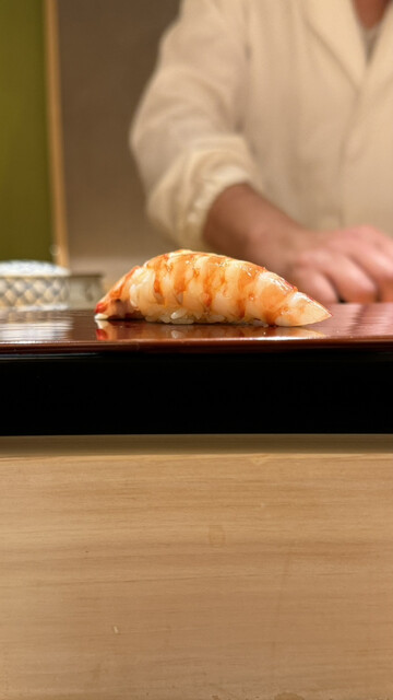 身はぷりっとしていながら、火入れが柔らかく、甘みが際立つ。噛むたびにじゅわりと旨みが広がり、白シャリの米酢が後味を引き締める。海老味噌の香りがほどよく立ち、香りが重ならないように設計されている。供出のタイミングが完璧で、温度が下がらないうちに提供されるため、最後の一噛みまで香りが生きたまま。江戸前らしい仕事の象徴的な一貫。