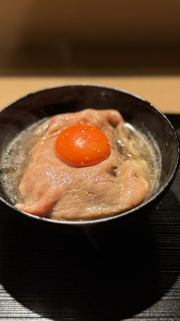 まずは野菜を出汁で軽く炊いてから、和牛をさっとくぐらせて一口。とろける脂と赤身の旨味が一気に押し寄せ、濃厚な味わいなのに、しつこさは全くなく、卵黄にくぐらせると幸福度がさらに倍増。