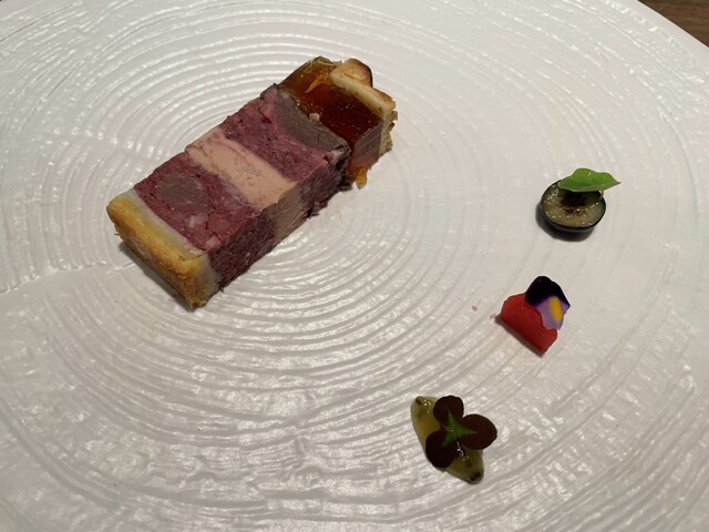 お肉の種類はアナグマ・ヒグマ・シカ・イノシシで、フォアグラのテリーヌと鹿のコンソメジュレも挟まれている。
