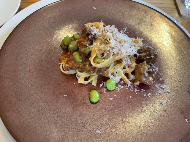 ラグーソースは由利牛と鹿角ポークを合わせた白ワインベースのトマト煮込みに枝豆を合わせている。