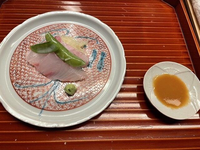 石鯛、馬鈴薯、スナップエンドウ、山葵、玉葱醤油。