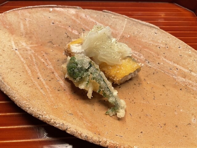 文旦の甘酸っぱい柑橘系の風味とプチプチとした食感が、天ぷらに絶妙な変化を与えている。
