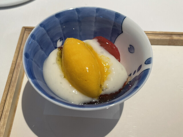 トマトはコンポートになっており、その上にはレモンバーベナというハーブを使った白いムース。