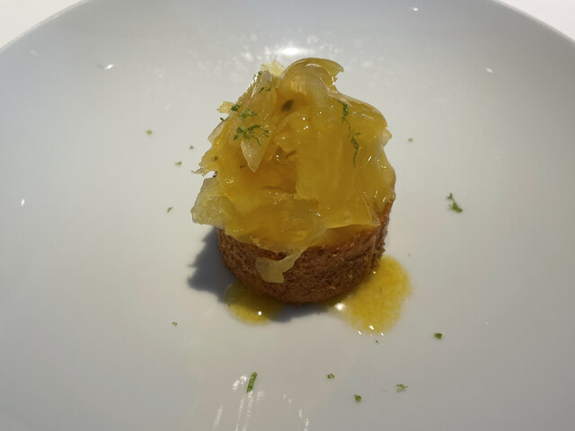 薄いタルト生地の上にカットしたタコが乗せられ、じゃがいものクリームとピーマンのピューレで味付けされている。