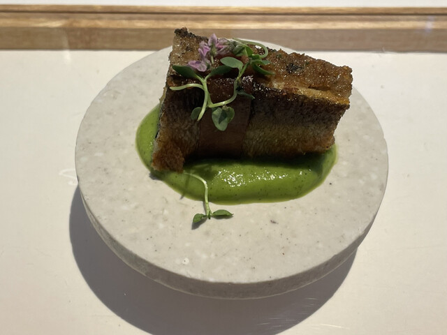 ほうれん草と鮎の肝を使ったリエットを鮎の身でサンドし、ズッキーニのピューレの上に乗せられている。