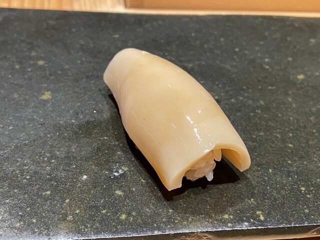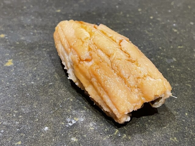 小振りの身が2枚重ねで握られる。ちなみに小さいものの方が旨味が強いとのこと。