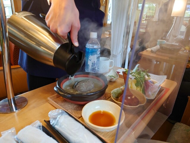 車内のため火は使えませんが、その代わり熱した石を入れた鍋に出汁を注ぐことで、温度を下げないようにしてしゃぶしゃぶを実現しています。