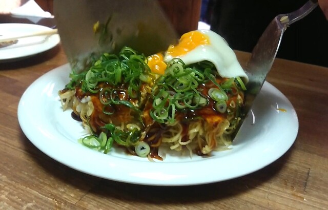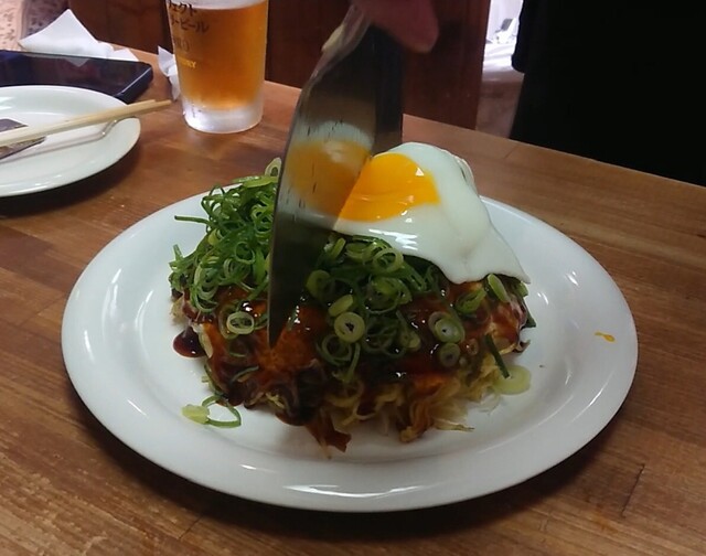 広島県流川地区は言わずと知れた繁華街。その賑わいは曜日を問わない。観光客様も目につくが圧倒的に地元民様が多い。若者多いなぁ~、いやいや、幅広い年齢層が…いぃ~っぱいで楽しそぉ。ガイドブック推し店やSNS話題店の軒先には長蛇の列がある。ん~、並ぶ価値もあるのだろうけど…スルーかなぁ。で、フラフラ街検索しているのも楽しぃ。で、目を引いたのが此方。風情ある外観にデカ暖簾。どちらかというと、やわらかな空気感をだしている処へ吸い込まれた。ほんわかイラッシャイマセぇ~を受けて案内されたのは手作り感あるテーブル席。10名も入ればパンパンになってしまうだろう狭小店内。キラキラ光る鉄板前カウンターには常連客様が鎮座。その光景もまたよし。まずはビールを頂戴する。豊富なレギュラーメニューの他、日替りや、新作メニュー表記にも引かれる。悩んでいると女将が親切に広島名物や店推し、人気品をガイドしてくれた。ちょこっと楽しむつもりでいたのに、、、アレヨアレヨと大量注文。やり過ぎたかなぁ~と思いながらPSBを煽りおかわり。と、やってきた店No.1メニューの「焼きポテトサラダ」のビジュアルに圧巻。確かに在りそうでない逸品がまた旨いのだ。仕上げのトロ~りチーズがまた後引く味わい。広島名物の細もやしをシャキシャキ焼きしてくれる『すごもり』や「こうね」も絶対的に外せない逸品に間違いなし。てばやく焼いてくれた「がんす」に箸が進む。北海道と広島のコラボ「アスパラ&エビ焼き」に春を感じながらレモンサワーシフト。で、メインが登場ぉ~ドぉ~んと、まん丸小高いお好み焼きに圧巻。どうやって崩せばいいのかわからず悩んでいると、優しい大将が可憐なコテサバキにて切り分けてくれた。見た目の通り軽い。モヤシ&キャベツの蒸気がフワフワにしているようだ。ネギ&玉子を含め、どの食材も『オタフクソース』が全体をまとめてくれる立役者。ってか、焼きの技術があってこそだろうけど…。