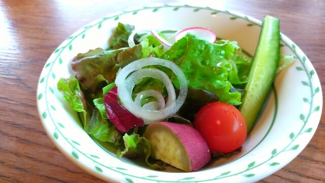 最初に高原野菜のサラダです。新鮮な野菜を美味しいドレッシングでいただきます。