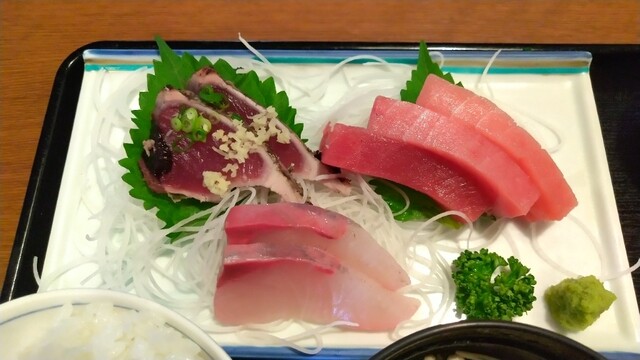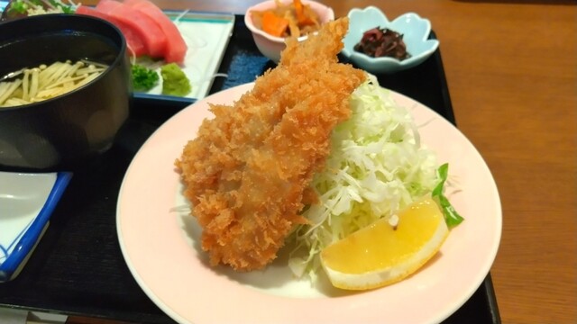 お刺身は3種でどれも美味しいです。ふわふわのアジフライにご飯が進み、お腹いっぱいです。