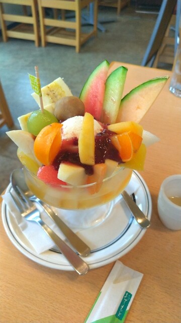 スイカ、メロン、リンゴ、柿、キーウイ、イチゴ、みかん、バナナなどフルーツがたくさん乗り、アイスクリームの上に生クリーム、チョコレートがかかり豪華なパフェ。これで700円です。