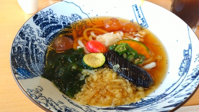 うどん上には揚げなす、天かす、わかめ、南瓜、オクラ、大根おろし、ミニトマト、ズッキーニが乗っています。