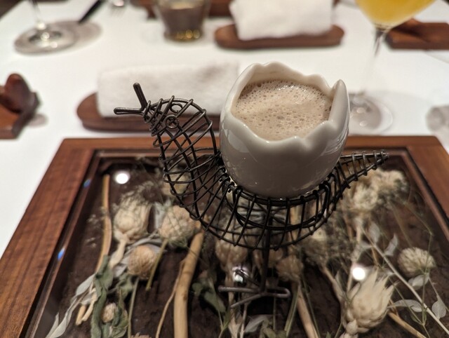 スプーンで救うと鹿肉や薬膳系の食材が。薬膳感も強すぎず、フレンチの中に溶け込むのが不思議なスープでした。