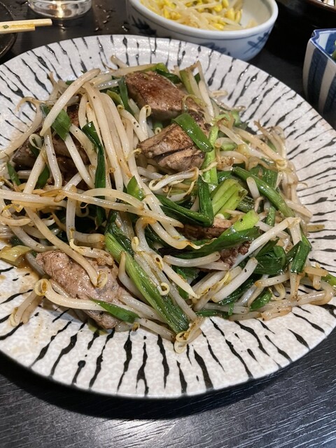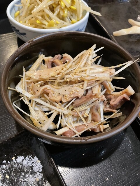 大豆もやし大盛り、ガツねぎ合え、辛モツ煮込み