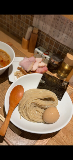 スープはブラッシュアップされ辛つけ麺になっています 逆にこれは新橋で提供のないテイスト まずは麺とスープを別々に頂いてみましたが やっぱりこれも美味しい 凝り固まったつけ麺の概念を崩してくれます!チャーシューも3種 味玉もいい感じに付け加えてスープ割を頼むと3種の薬味 ひとつは梅味のご飯です これがまた美味い ぶどう山椒も良き味変アイテムで気に入りました またきますね
