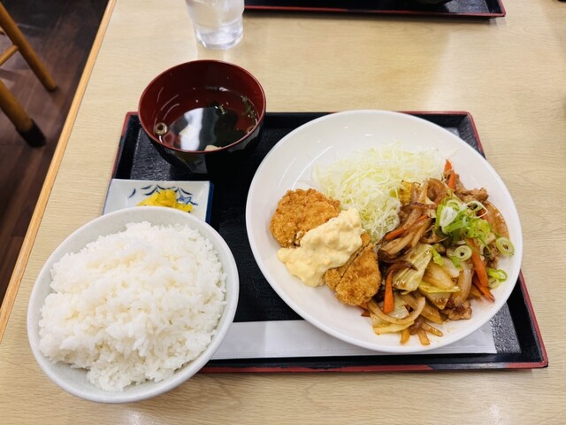 ホタテフライ&豚バラと野菜の甘辛炒めの定食です!