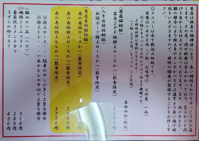 ロースなら、南の島豚ロースかつならあるって事ですが、定食にるすと約3千円