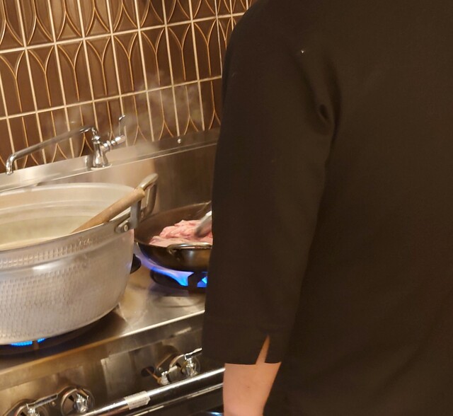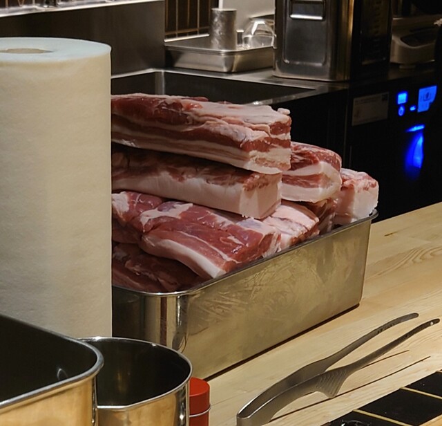 麺をすすりながら、厨房で豚バラの仕込みをする光景を眺めていると、写真撮り