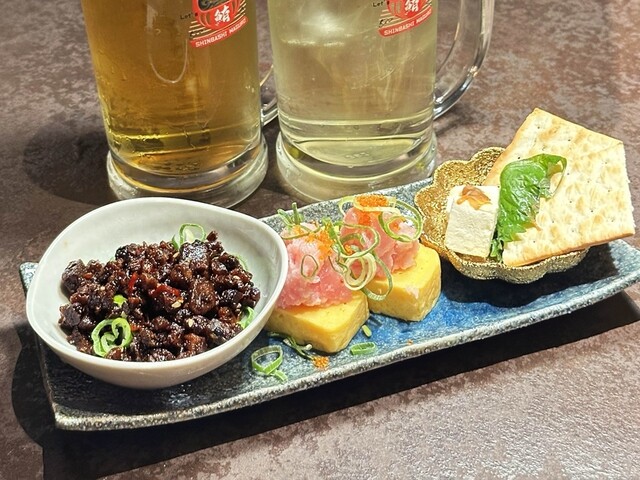 クリームチーズに鮪の酒盗が乗ってるヤツと煮込んだ佃煮みたいなヤツ。