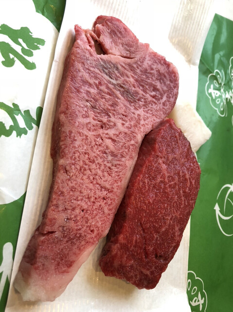 100gカルビ900円、赤身肉450円、テンダーロインステーキ1500円くらい。