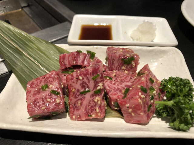 上たん塩、厚切りたん塩から始まり、上カルビ、ランプステーキ、角切りハラミ、熟成肉。