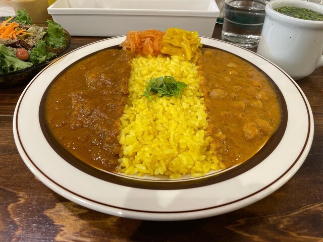 元気になる野菜のサラダと豆カレーとチキンカレーのあいがけ、ラッシーをいただきました