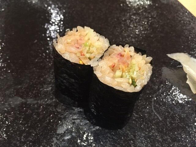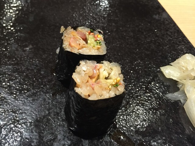 本マグロヅケ、小柱海苔巻き、ムラサキウニ、車エビ、コハダ、キンメダイ、
