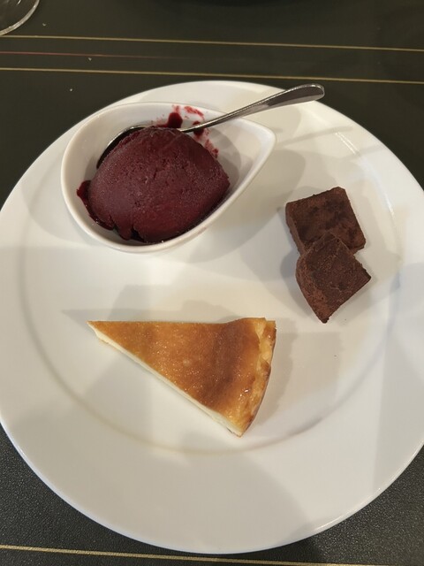チーズケーキ、カシスのソルベ、オレンジ風味の生チョコ