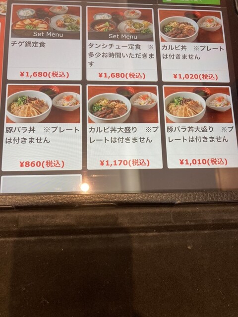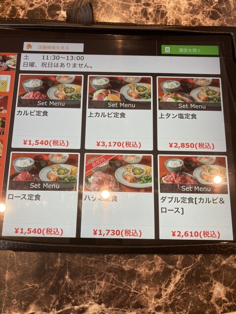 2人で「ロース定食¥1540」「カルビ定食¥1540」「ご飯大盛り¥150」を注文。
