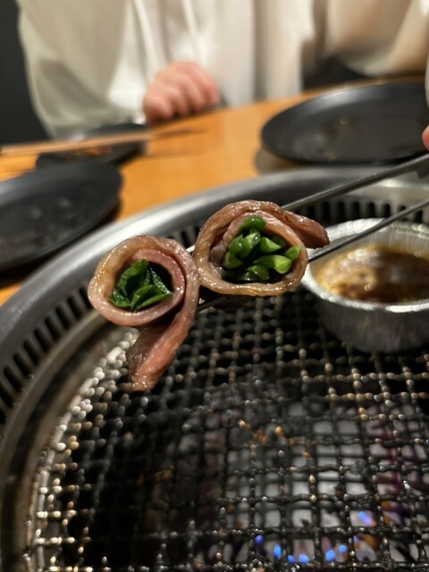 ニラをたっぷり巻いたロースのサシが綺麗に入っていて美しいです。