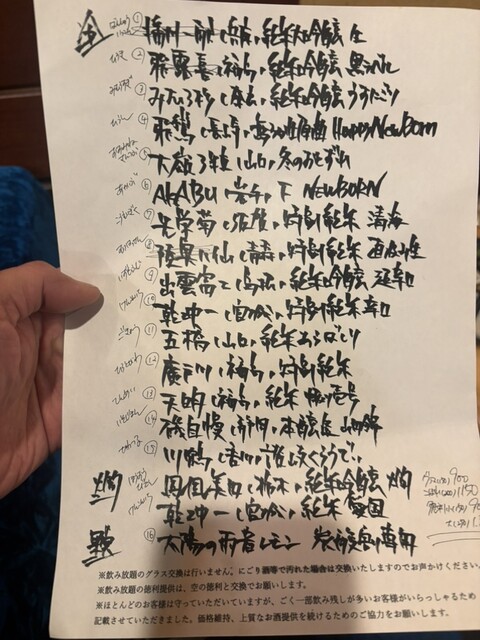 日本酒飲み放題2時間半つきで5500円の通常コース。レアな酒を含む上位コースも魅力的ですが、この通常コースでも十分。