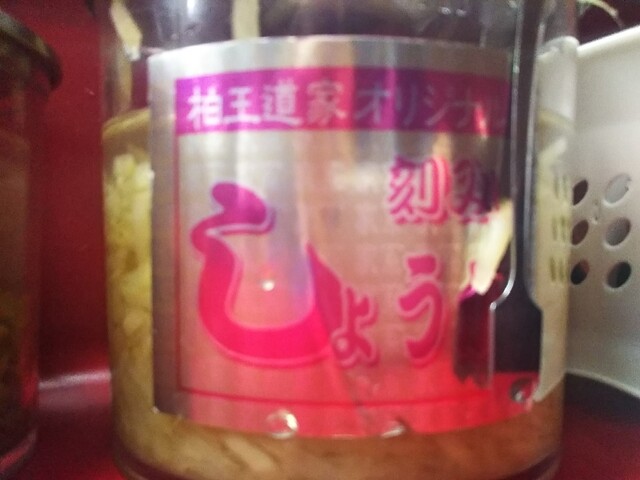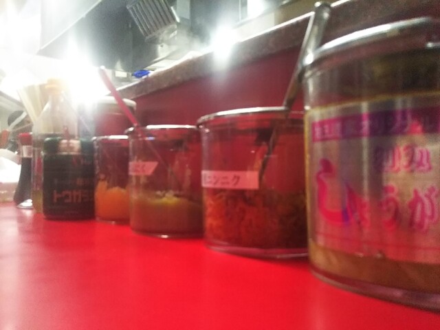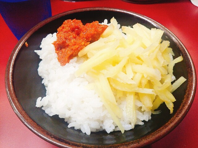 ライスには、卓上調味料ラインナップから王道家特製のショウガ・唐辛子調味料をオン。スープに浸した海苔でくるり→パクり。ラーメンコショーを少々かけてもgood。これがまたたまりません。
