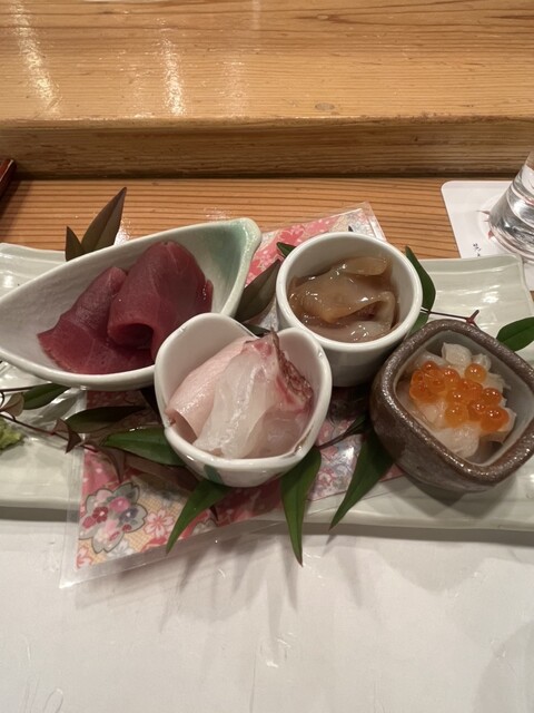 鮪、縞鯵、淡路鯛、烏賊の塩辛?、帆立とイクラ。
