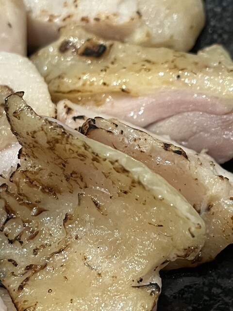 麺助鶏の炙り、こちらも絶品。元から高級な鶏さんの、本来メインで使う部位のいわゆる「切り落とし」ですから、ビジュアルはとにかく、味が一流なのは分かり切ったこと。ただ、その味、高級料理店での鶏のそれ。口に含むと脂から肉から全てから鶏の旨味がしみ出し、飲み込むのが勿体ないほどですよ。