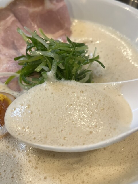 白い器に淡雪のように表面を覆う泡。大き目の豚チャーシューが追加分入れて3枚。燻製卵半分。真ん中にこんもり青葱。