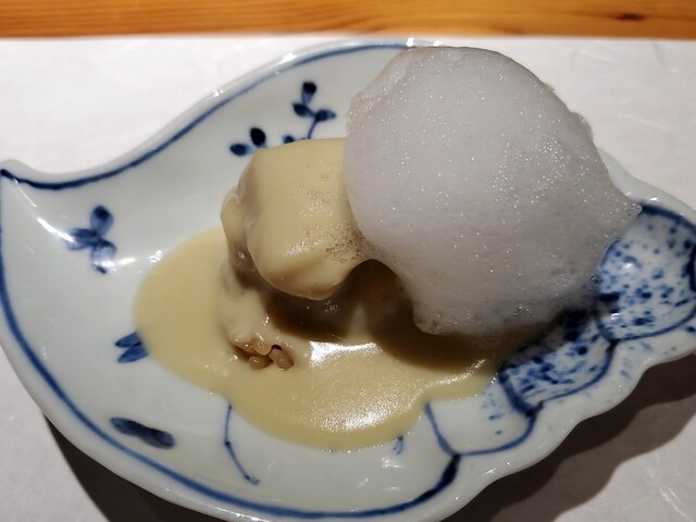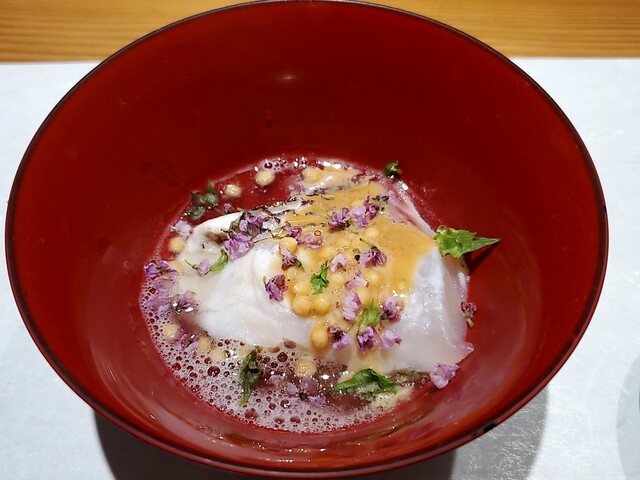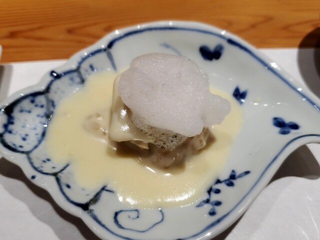 香ばしく食欲をそそる焼茄子ソースに三大高級魚スジアラの松笠を合わせた逸品から始まりました。皮目の旨味と食感がソースにとてもよく合います。誰が食べてもわかりやすくその素晴らしさを感じる事ができるものが1皿目に出ることの意味。初めての方もリピートの方もこの最初のお料理を口にすることで本日のこの席が素晴らしく価値のある時間になることを確信するはずです。誰もが自然と笑顔になる1品目でした。