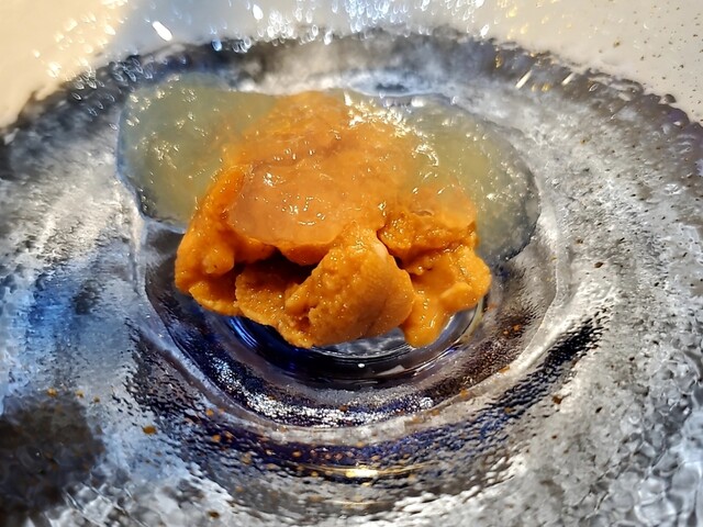 藁焼きの薫香を付けたスマガツオの炙りに合わせるのは酒盗とクリームチーズを使った白いソース、これはまさに白い麻薬。何度食べても悶絶級の美味しさでありカウンター全員がソースに夢中。