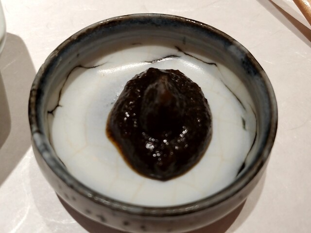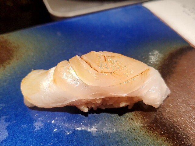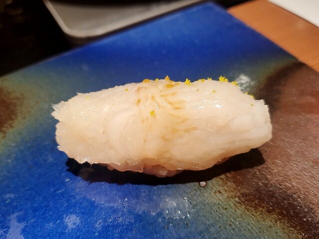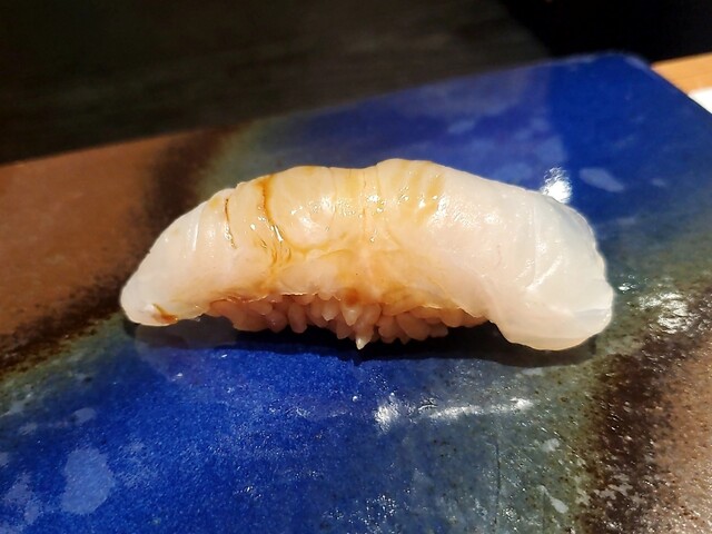 全国どこの鮨屋でも出てくるようになった鮑の肝ソースリゾットの奄美大島版と言える一皿であり、南ならではの食材を合わせて食感と香りと余韻を楽しめるという完成度と夜光貝の地域性から見ても碧海さんで食べたい逸品です。